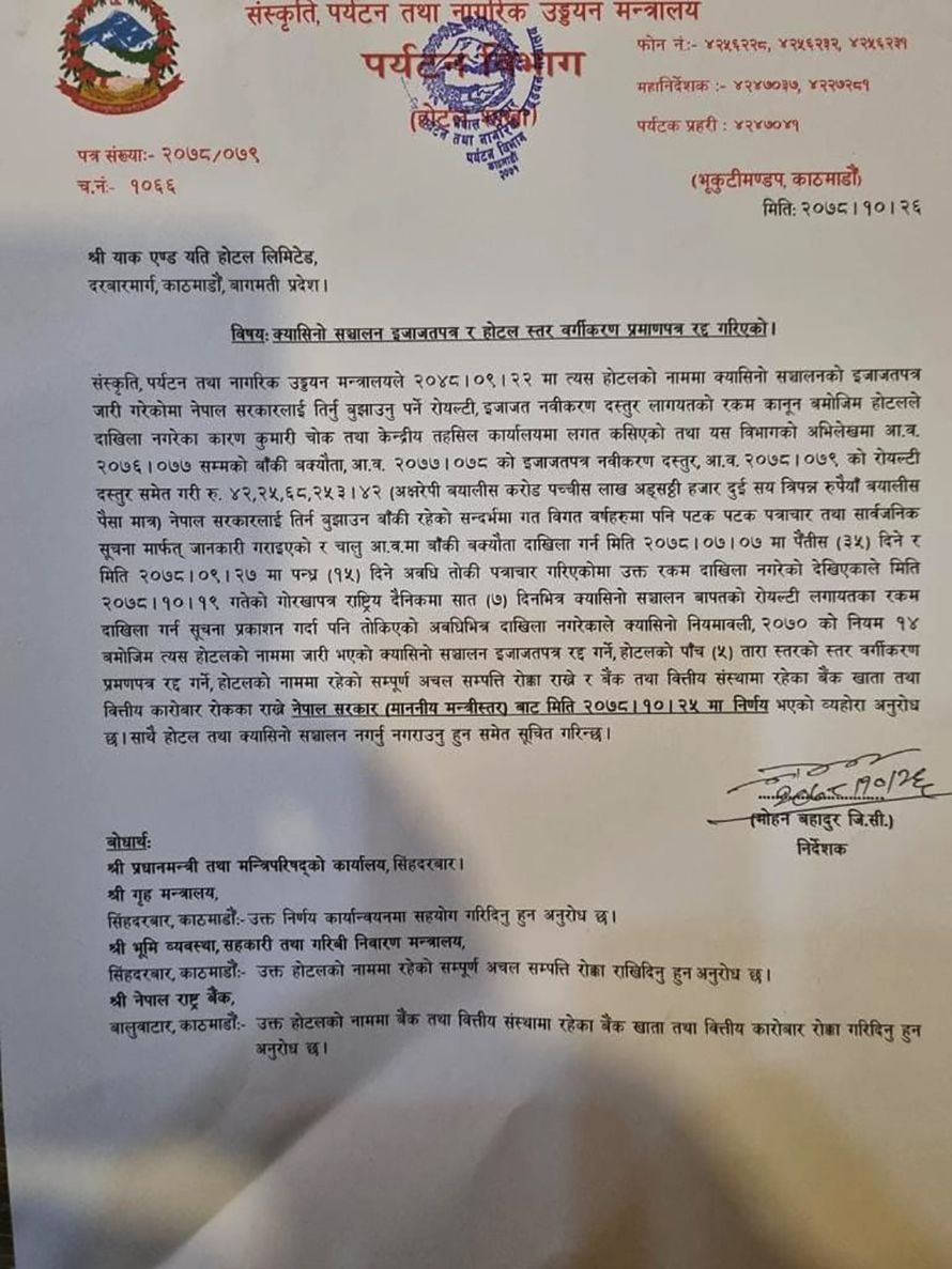 काठमाडौं दरबारमार्गमा रहेको  होटल याक एण्ड यती र सोहि होटेलद्वारा  सञ्चालित क्यासिनो सञ्चालन नगर्न पर्यटन तथा नागरिक उड्डयन मन्त्रालयले निर्देशन दिएको छ ।