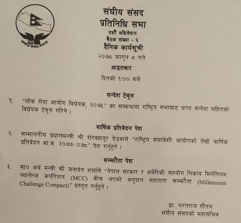 काठमाडौं । प्रतिनिधिसभाको आजको बैठकमा नेपाल सरकार र अमेरिकी सहयोग निकाय मिलेनियम च्यालेन्ज कर्पोरेशन एमसिसी बीच भएको अनुदान सहायता सम्झौता पेस हुने भएको छ । सङ्घीय संसद् सचिवालयले आजको बैठकका लागि तय गरेको कार्यसूचीको तेस्रो नम्बरमा उक्त सम्झौता पेस गरिनेछ । अर्थमन्त्री जनार्दन शर्माले सो सम्झौता पेस गर्ने छन् । आजको बैठकमा लोक सेवा आयोग विधेयक, २०७५ का सम्बन्धमा राष्ट्रियसभाबाट प्राप्त सन्देशसहितको विधेयक टेबल गर्ने र प्रधानमन्त्री शेरबहादुर देउवाले राष्ट्रिय समावेशी आयोगको तेस्रो वार्षिक प्रतिवेदन आव २०७७-७८ पेस गर्नुहुने कार्यक्रम छ ।