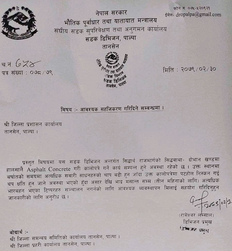 पाल्पा । सडक डिभिजन कार्यालय पाल्पाले तीन महिनाका लागि बुटवल–पाल्पा सडक खण्डमा टिपर चलाउन रोक लगाएको छ । कार्यालयले एक सुचना जारी गर्दै आगामी तीन महिना सिद्धार्थ राजमार्गको तानसेन बुटवल सडक खण्डमा बाटोमा टिपर चलाउन रोकिएको हो ।