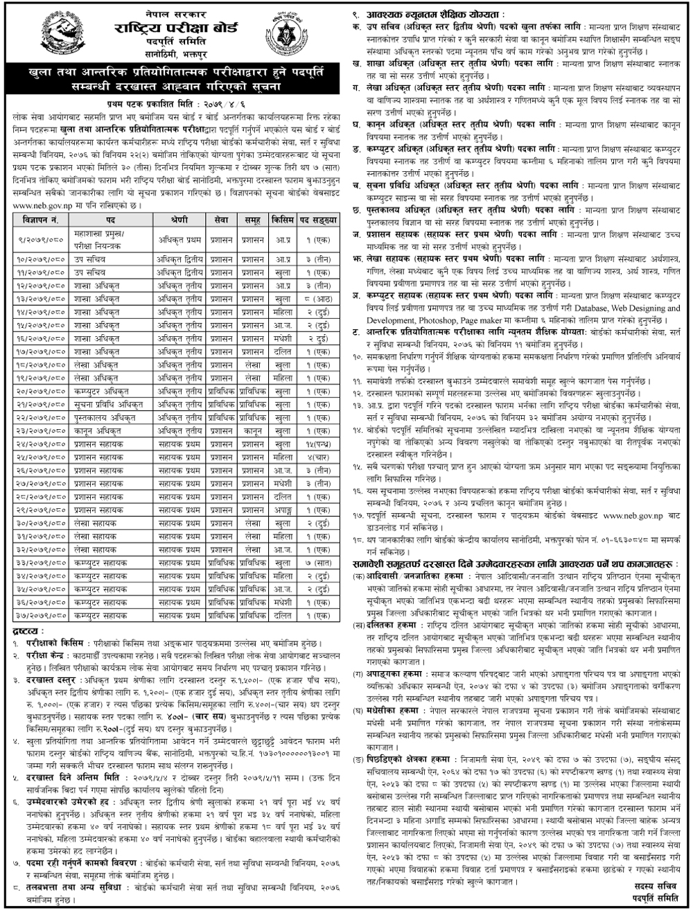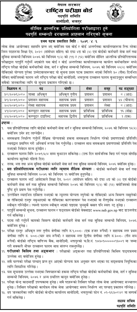 पदपूर्ति समितिले आन्तरिक प्रतियोगिता मार्फत ११३ रिक्त दरबन्दीका लागि र खुला प्रतियोगिता मार्फत ७३ रिक्त दरबन्दीका लागि दरखास्त आह्वान गरेको  छ  । बोर्ड अन्र्तगतका कार्यलयहरुमा रिक्त रहेका पदहरुमा सूचना जारी भएको ३० दिनभित्र नियमित शुल्कमा र थप ७ दिन भित्र दोब्बर शुल्कमा तोकिए बमोजिमको योग्यता पुगेका उम्मेद्वारहरुले राष्ट्रिय परीक्षा बोर्ड सानोठिमी भक्तपुरमा फाराम बुझाउन सकिने सूचनामा उल्लेख गरिएको छ ।
