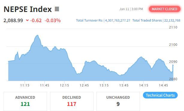 काठमाडौँ । साताको कारोबारको अन्तिम दिन (आज) बिहीबार सेयर बजार मापक नेप्से परिसूचक सामान्य अंकले घटेको छ । कारोबारको अघिल्लो दिनको तुलनामा आज नेप्से परिसूचक ०.६२ अंकले घटेर २०८८.९९ बिन्दुमा पुगेको हो ।