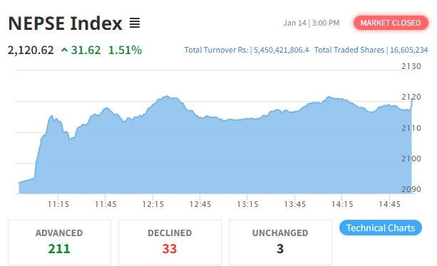 काठमाडौँ । साताको कारोबारको पहिलो दिन (आज) आइतबार सेयर बजार मापक नेप्से परिसूचक बढेको छ । कारोबारको अघिल्लो दिनको तुलनामा आइतबार नेप्से परिसूचक ३१.६२ अंकले बढेर २१२०.६२ बिन्दुमा पुगेको हो ।