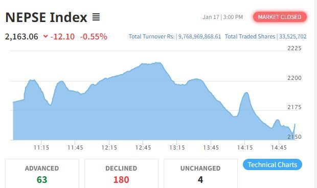 काठमाडौँ । नेप्से परिसूचक बुधबार घटेको छ । बुधबार नेप्से परिसूचक १९.१० अंकले घटेर २१६३.०६ बिन्दुमा पुगेको हो ।