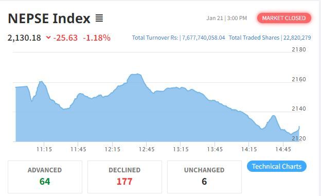 काठमाडौँ । साताको कारोबारको पहिलो दिन (आज) आइतबार नेप्से परिसूचक घटेको छ । कारोबारको अघिल्लो दिनको तुलनामा आइतबार नेप्से परिसूचक २५.६३ अंकले घटेर २१३०.१८ बिन्दुमा पुगेको हो ।