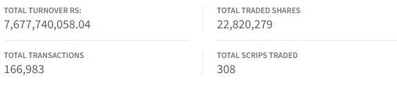 आज नेप्सेमा कुल ३ सय ८ कम्पनीको २ करोड २८ लाख २० हजार २ सय ७९ कित्ता सेयर खरिद बिक्री हुँदा ७ अर्ब ६७ करोड ७७ लाखमाथिको सेयर कारोबार भएको छ ।