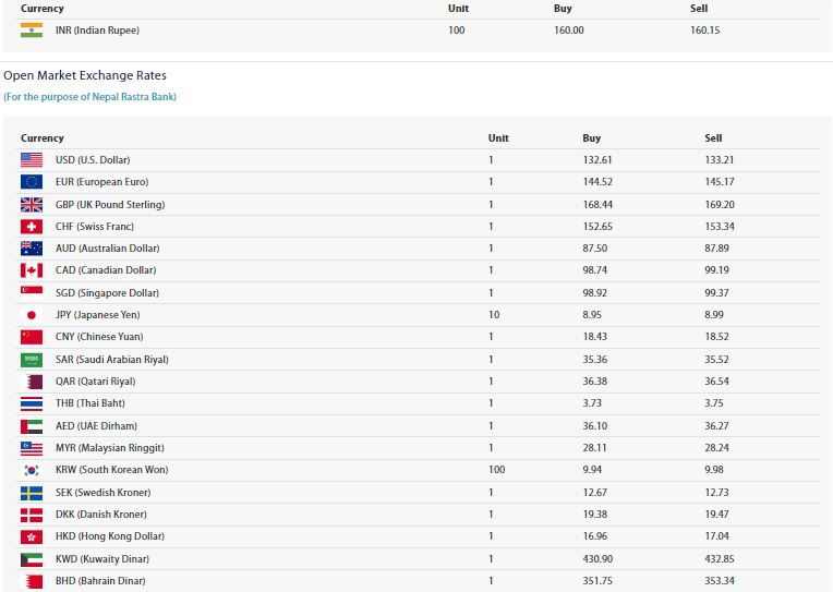 यस्तै, युरो एकको खरिद दर १ सय ४४ रुपैयाँ ५२ पैसा र बिक्री दर १ सय ४५ रुपैयाँ १७ पैसा रहेको छ । बेलायती पाउण्ड एकको खरिद दर १ सय ६८ रुपैयाँ ४४ पैसा र बिक्री दर १ सय ६९ रुपैयाँ २० पैसा रहे को छ । त्यसैगरी सोमबार क्यानेडियन डलर एकको खरिद दर ९८ रुपैयाँ ७४ पैसा र बिक्री दर ९९ रुपैयाँ १९ पैसा रहेको छ ।
