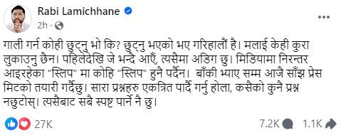 उनेले सामाजिक सञ्जालमा लेखेका छन्, ‘गाली गर्न कोही छुट्नु भो कि ? छुट्नु भएको भए गरिहालौं है। मलाई केही कुरा लुकाउनु छैन। पहिलेदेखि जे भन्दै आएँ, त्यसैमा अडिग छु । मिडियामा निरन्तर आइरहेका ‘स्लिप’मा कोहि ‘स्लिप’ हुनै पर्दैन। बाँकी भ्याए सम्म आजै साँझ प्रेस मिटको तयारी गर्दैछु । सारा प्रश्नहरु एकत्रित पार्दै गर्नु होला, कसैको कुनै प्रश्न नछुटोस् । त्यसैबाट सबै स्पष्ट पार्ने नै छु ।’