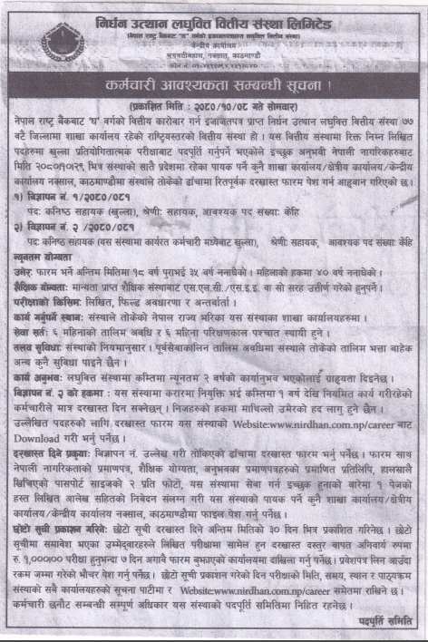 काठमाडौँ । निर्धन उत्थान लघुवित्त वित्तीय संस्था लिमिटेडले केही संख्यामा कर्मचारी माग गरेको छ । लघुवित्तले कनिष्ठ सहायक (खुल्ला) र (सोही संस्थामा कार्यरत कर्मचारी मध्येबाट खुल्ला) सहायक श्रेणीमा कर्मचारी माग गरेको हो ।