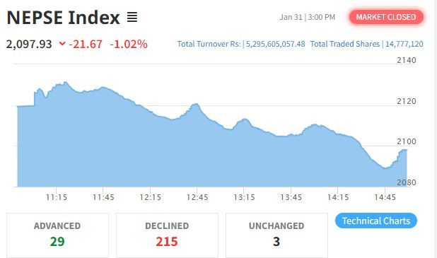 काठमाडौँ । साताको कारोबारको चौँथो दिन (आज) बुधबार सेयर बजार मापक नेप्से परिसूचक घटेको छ । कारोबारको अघिल्लो दिनको तुलनामा बुधबार नेप्से परिसूचक २१.६७ अंकले घटेर २०९७.९३ बिन्दुमा पुगेको हो ।