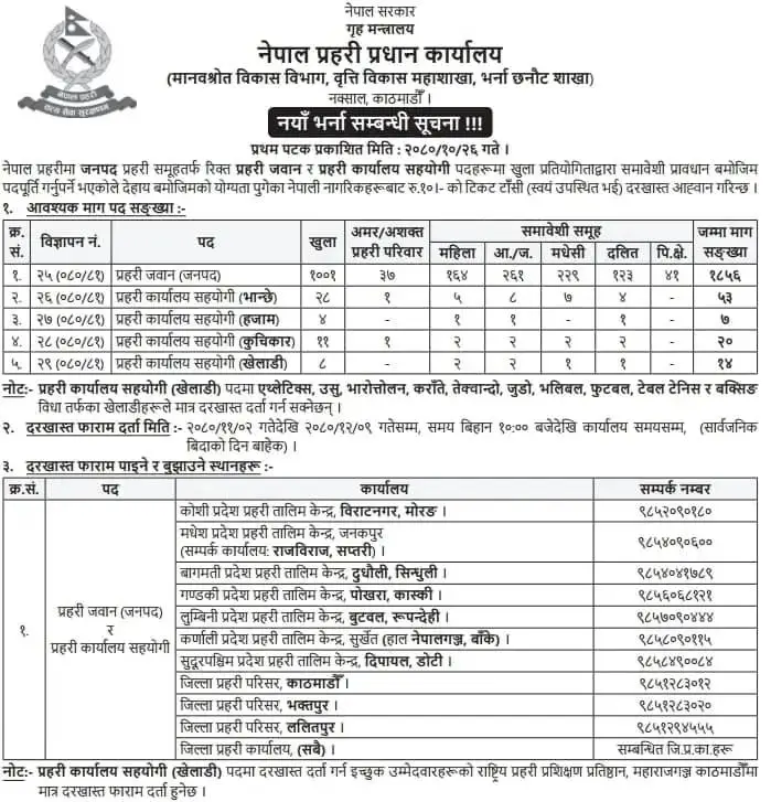 प्रहरी प्रधान कार्यालय नक्शालले शुक्रबार एक सुचना जारी गर्दै १ हजार ८ सय ५६ जना जवान पदमा दरखास्त माग गरेको छ । यसैगरी भान्छे ५३, हजाम ७, कुचिकार २० र खेलाडी १४ जनाका लागिसमेत दरखास्त माग गरेको हो । खेलाडीमा एथलेटिक्स, उसु, भारोत्तोलन, कराँते, तेक्वान्दो, जुडो, भलिबल, फुटबल, टेबल टेनिस र बक्सिङ विधामा मात्र दरखास्त दिन पाइने छ ।