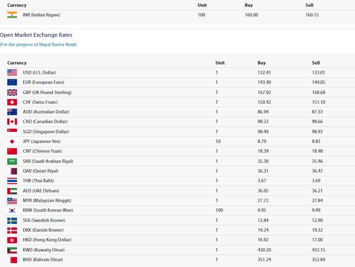 यस्तै, युरो एकको खरिद दर १ सय ४३ रुपैयाँ ४० पैसा र बिक्री दर १ सय ४४ रुपैयाँ ०५ पैसा रहेको छ । बेलायती पाउण्ड एकको खरिद दर १ सय ६७ रुपैयाँ ९२ पैसा र बिक्री दर १ सय ६८ रुपैयाँ ६८ पैसा रहेको छ ।