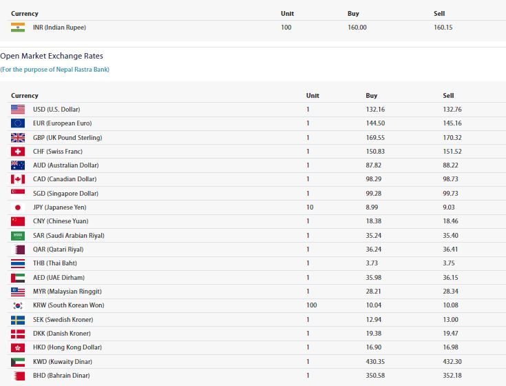 यस्तै, युरो एकको खरिद दर १ सय ४४ रुपैयाँ मुल्य ५० पैसा र बिक्री दर १ सय ४५ रुपैयाँ १६ पैसा रहेको छ । आज बेलायती पाउण्ड एकको खरिद दर १ सय ६९ रुपैयाँ ५५ पैसा र बिक्री दर १ सय ७० रुपैयाँ ३२ पैसा रहेको छ ।