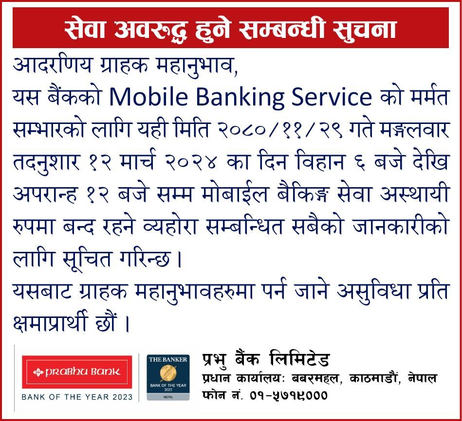 काठमाडौँ । प्रभु बैंकको मोबाईल बैंकिङ सेवा अवरुद्ध हुने भएको छ । सो बैंकको मोबाईल बैंकिङ सेवा मर्मत सम्भार गर्नका लागि यही फागुन २९ गते केही समयका लागि अवरुद्ध हुने भएको हो ।
