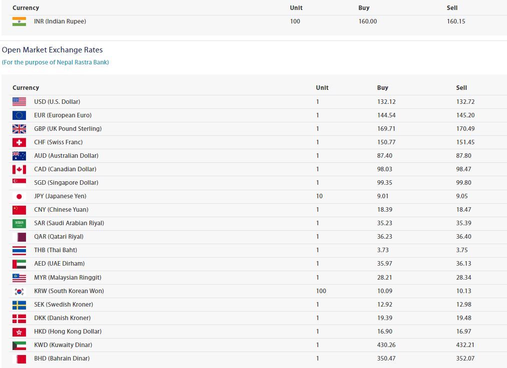 यस्तै, युरो एकको खरिद दर १ सय ४४ रुपैयाँ मुल्य ५४ पैसा र बिक्री दर १ सय ४५ रुपैयाँ २० पैसा रहेको छ । आज बेलायती पाउण्ड एकको खरिद दर १ सय ६९ रुपैयाँ ७१ पैसा र बिक्री दर १ सय ७० रुपैयाँ ४९ पैसा रहेको छ ।