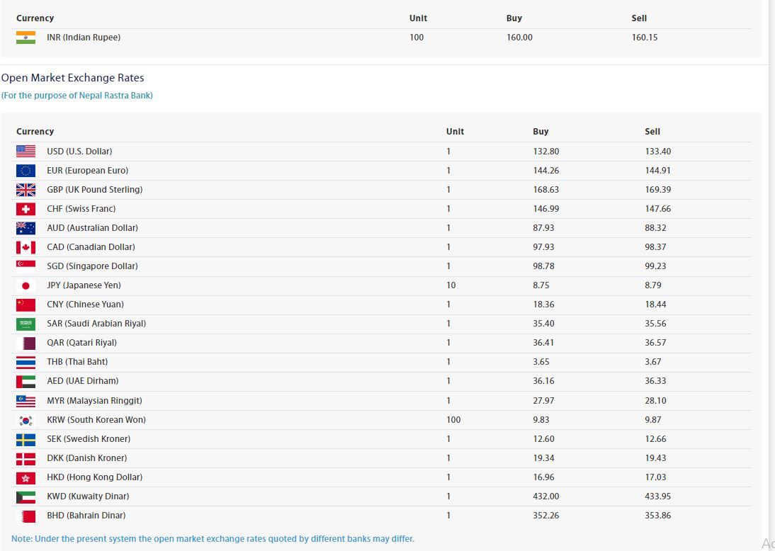 यस्तै, युरो एकको खरिद दर १ सय ४४ रुपैयाँ २६ पैसा र बिक्री दर १ सय ४४ रुपैयाँ ९१ पैसा रहेको छ । आज बेलायती पाउण्ड एकको खरिद दर १ सय ६८ रुपैयाँ ६३ पैसा र बिक्री दर १ सय ६९ रुपैयाँ ३९ पैसा रहेको छ ।