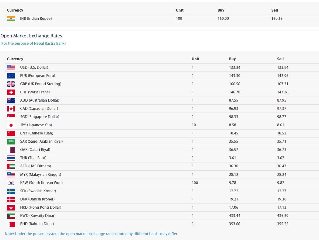 त्यस्रैगरी आज युरो एकको खरिद दर १ सय ४३ रुपैयाँ ३० पैसा र बिक्री दर १ सय ४३ रुपैयाँ ९५ पैसा रहेको छ । यता बेलायती पाउण्ड एकको खरिद दर १ सय ६६ रुपैयाँ ५६ पैसा र बिक्री दर १ सय ६७ रुपैयाँ ३१ पैसा कायम भएको छ ।