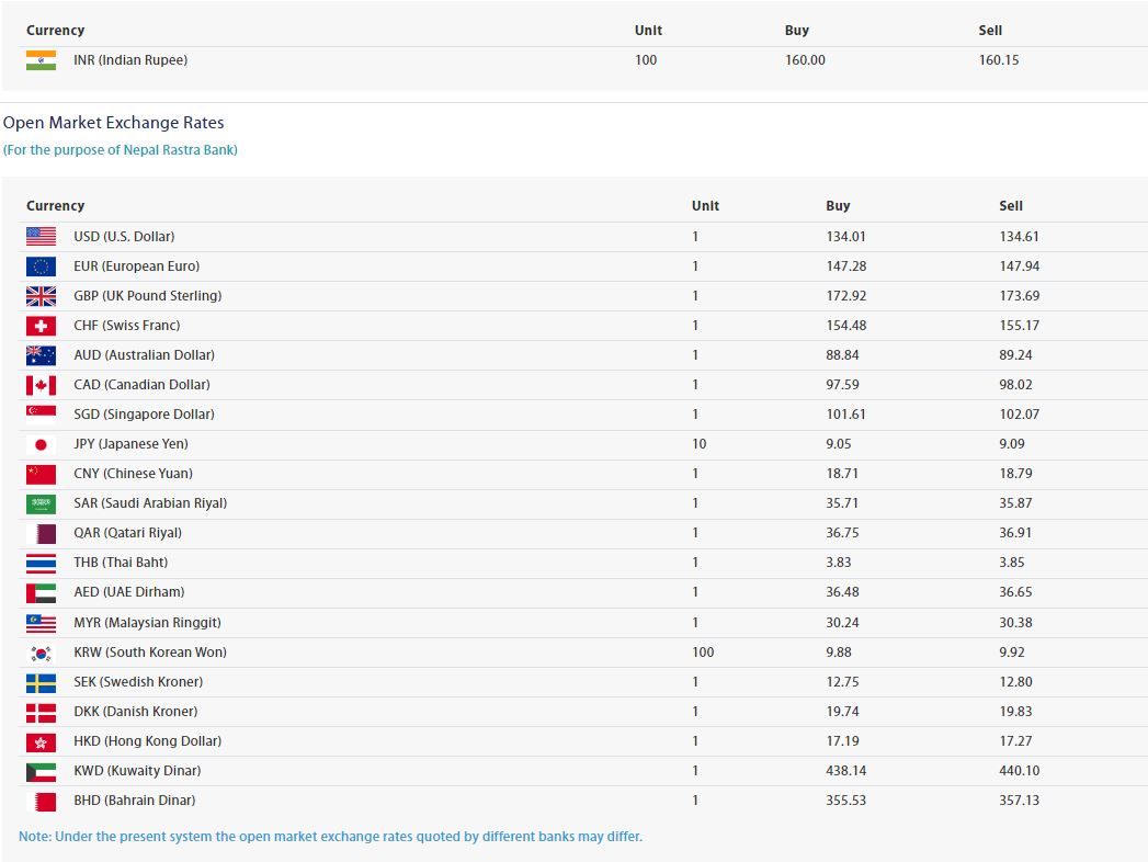 आज युरो एकको खरिद दर १४७ रुपैयाँ २८ पैसा र बिक्री दर १४७ रुपैयाँ ९४ पैसा रहेको छ । आइतबार बेलायती पाउण्डको खरिद दर १७२ रुपैयाँ ९२ पैसा र बिक्री दर १७३ रुपैयाँ ६९ पैसा रहेको छ ।