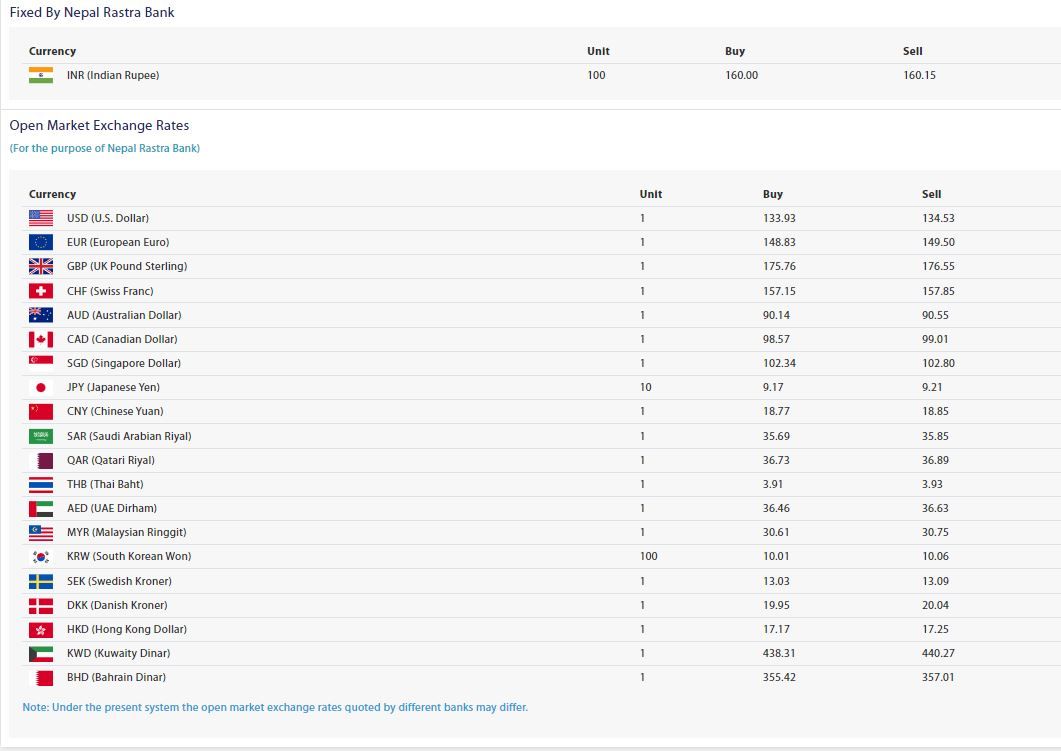 काठमाडौँ । नेपाल राष्ट्र बैंकले (आज) आइतबारका लागि विदेशी मुद्राको विनिमय दर सार्वजनिक गरेको छ । राष्ट्र बैंकले सार्वजनिक गरेको विनिमय दर अनुसार आज अमेरिकी डलर एकको खरिद दर १३३ रुपैयाँ ०३ पैसा र बिक्री दर १३४ रुपैयाँ ६३ पैसा रहेको छ ।