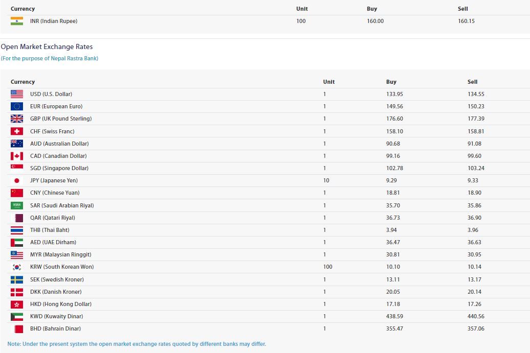 आज युरो एकको खरिद दर १४९ रुपैयाँ ५६ पैसा र बिक्री दर १५० रुपैयाँ २३ पैसा रहेको छ । मंगलबार बेलायती पाउण्डको खरिद दर १७६ रुपैयाँ ६० पैसा र बिक्री दर १७७ रुपैयाँ ३९ पैसा रहेको छ ।