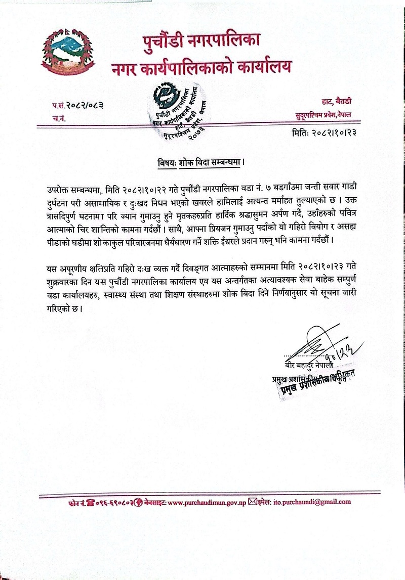 काठमाण्डौ । बैतडीमा जन्ती बोकेको बस दुर्घटनामा परि हिजो १३ जनाको ज्यान गएपछि पुर्चौडी नगरपालिकाले आज शोक बिदा दिएको छ । नगरपालिकाले विज्ञप्ति निकाल्दै घटनाप्रति गहिरो दुःख व्यक्त गरेको छ । आज नगरपालिका कार्यालय, वडा कार्यालयहरू, स्वास्थ्य संस्था तथा शिक्षण संस्थाहरू बन्द गरिएको छ ।