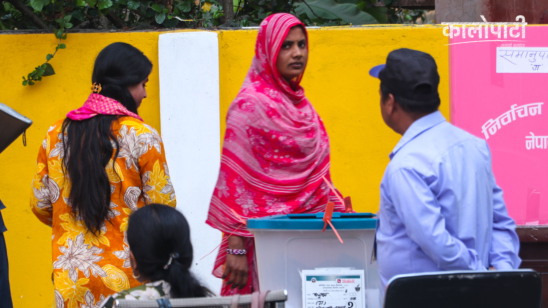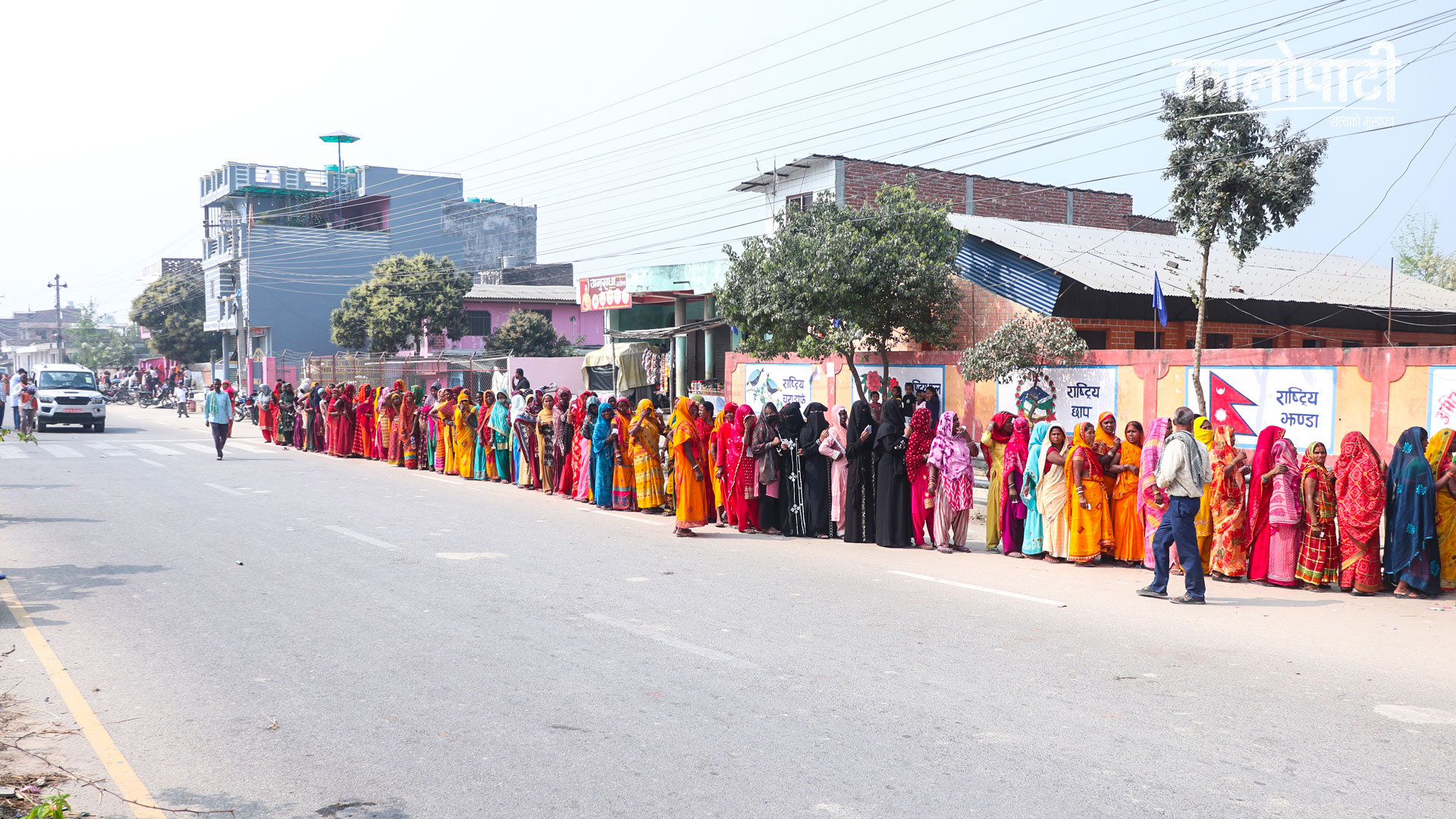 मतदान केन्द्रहरूमा महिलाहरू लामबद्ध भएर आफ्नो मताधिकार प्रयोग गरिरहेका छन्।