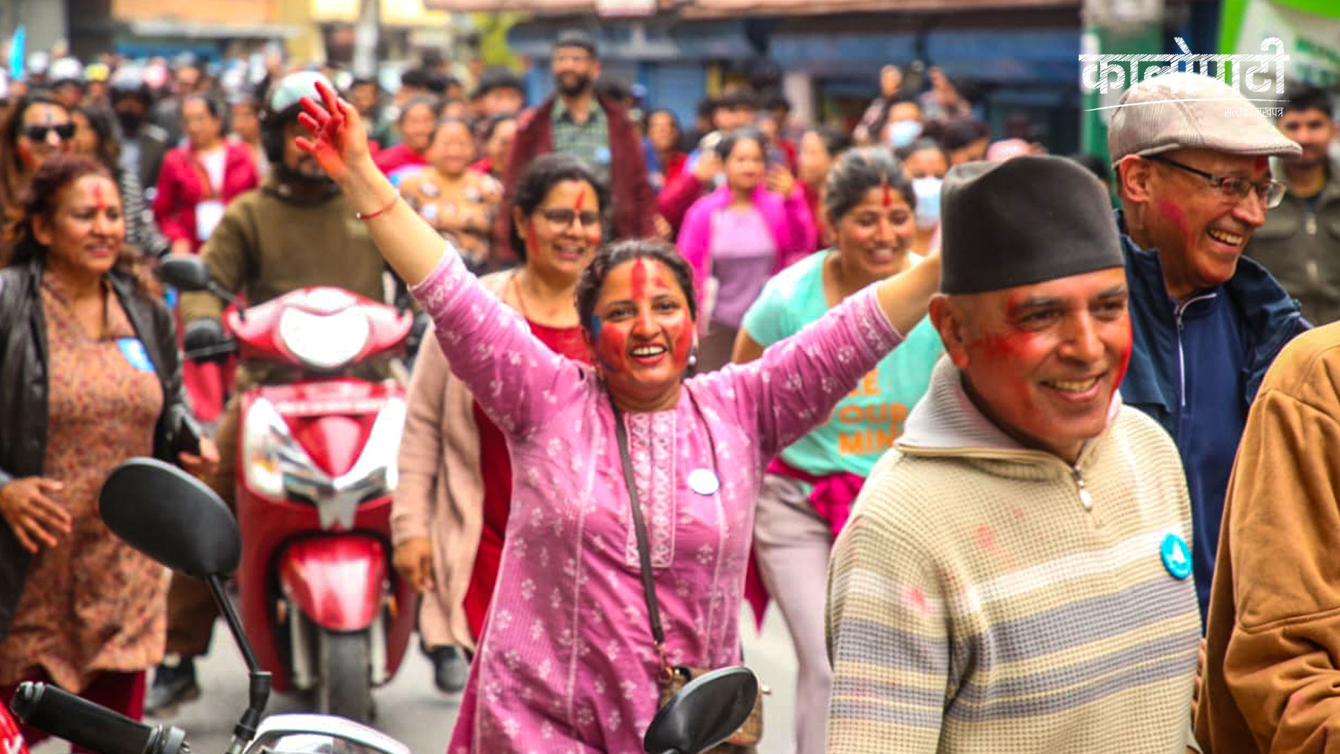 काठमाडौं । काठमाडौं क्षेत्र नम्बर १ मा राष्ट्रिय स्वतन्त्र पार्टीकी उम्मेदवार रञ्जु न्यौपाने विजयी भएसँगै विजयी र्याली निकालिएको छ । विजयी र्यालीमा रास्वपाका नेता, कार्यकर्ताहरु उत्साहका साथ सहभागी भएका छन् ।