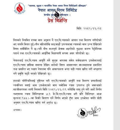 विज्ञप्तिमा भनिएको छ, ‘निगमले नियमित रुपमा माग अनुरूप नै एल. पि.ग्यासको आयात तथा वितरण गरीरहेको भए तापनि विगत दुईरतीन महिनादेखि काठमाडौं उपत्यकामा ग्यासको माग उच्च देखिएको विषय सर्वविदित नै छ । यसै बीच मध्यपूर्व क्षेत्रमा भइरहेको युद्धका कारण पेट्रोलियम पदार्थ तथा एल.पि. ग्यासको आपूर्तिमा विश्वव्यापी रूपमा असर परिरहेको छ ।’