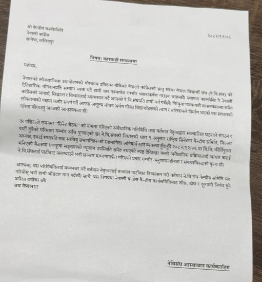 “अवैधानिक प्रक्रियाका आधारमा नेविसंघलाई पार्टीबाट अलग्याउने भन्दै सञ्चार माध्यममार्फत गरिएको प्रचार गम्भीर अनुशासनहीनता हो,“ ज्ञापनपत्रमा भनिएको छ, “यस्ता गतिविधिले संगठनको हित गर्दैनन् ।“