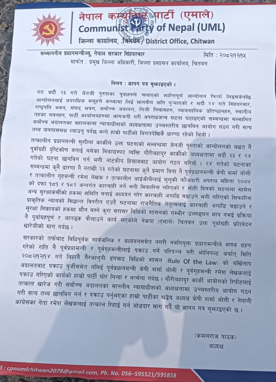 आइतबार चितवनस्थित जिल्ला प्रशासन कार्यालयमार्फत प्रधानमन्त्रीलाई बुझाइएको ज्ञापनपत्रमा भदौ २३ र २४ गते भएका घटनाको निष्पक्ष छानबिन गर्नुपर्ने माग दोहोर्याइएको छ ।