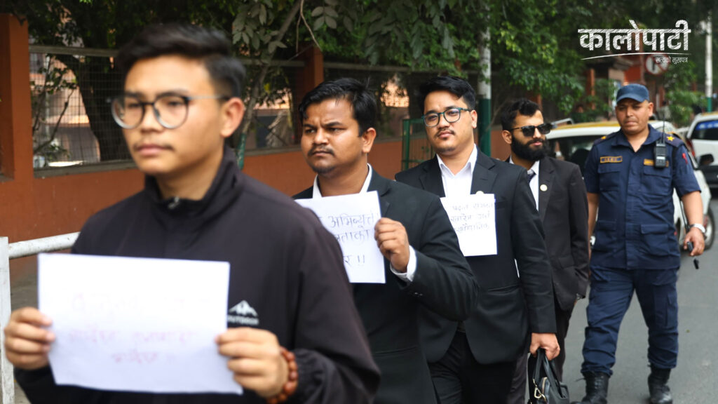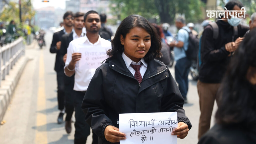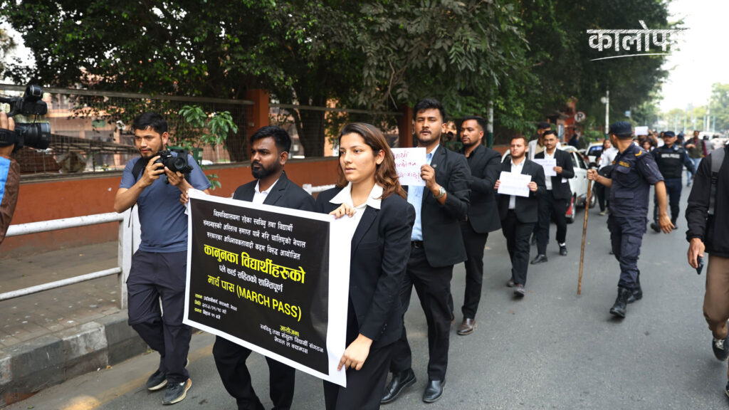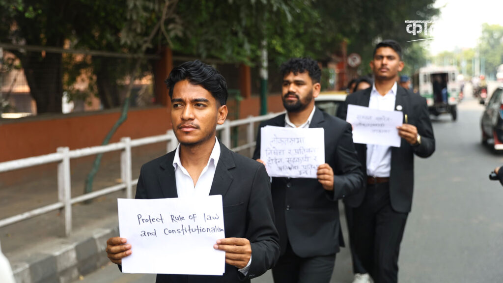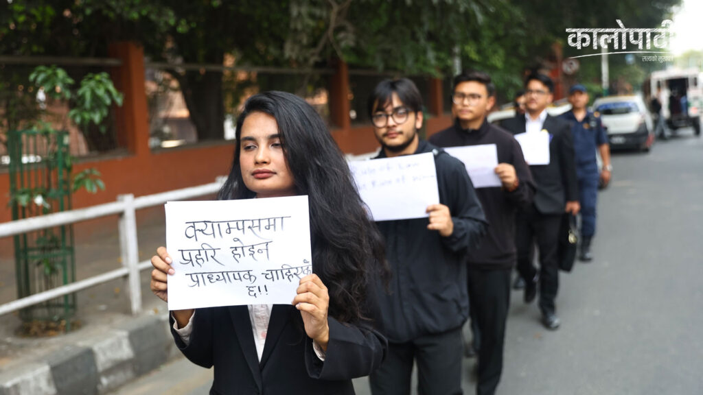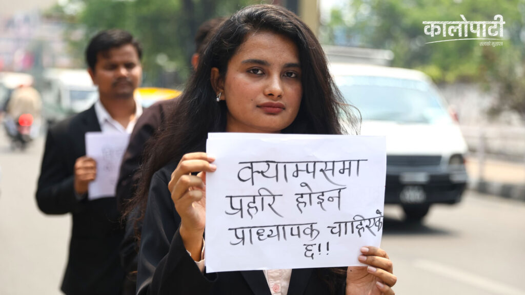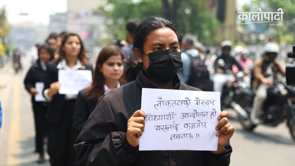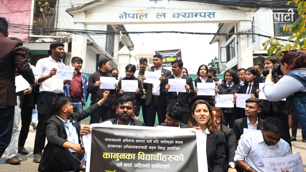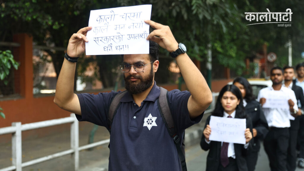 भृकुटीमण्डपस्थित नेपाल ल क्याम्पस परिसरमा बुधबार आयोजित प्रदर्शनमा सहभागी विद्यार्थीहरूले ‘कालो चस्मा कालो मन, नयाँ सरकारको उपलब्धि धन नै धन’ लगायतका नारासहित प्लेकार्ड प्रदर्शन गरेका थिए।