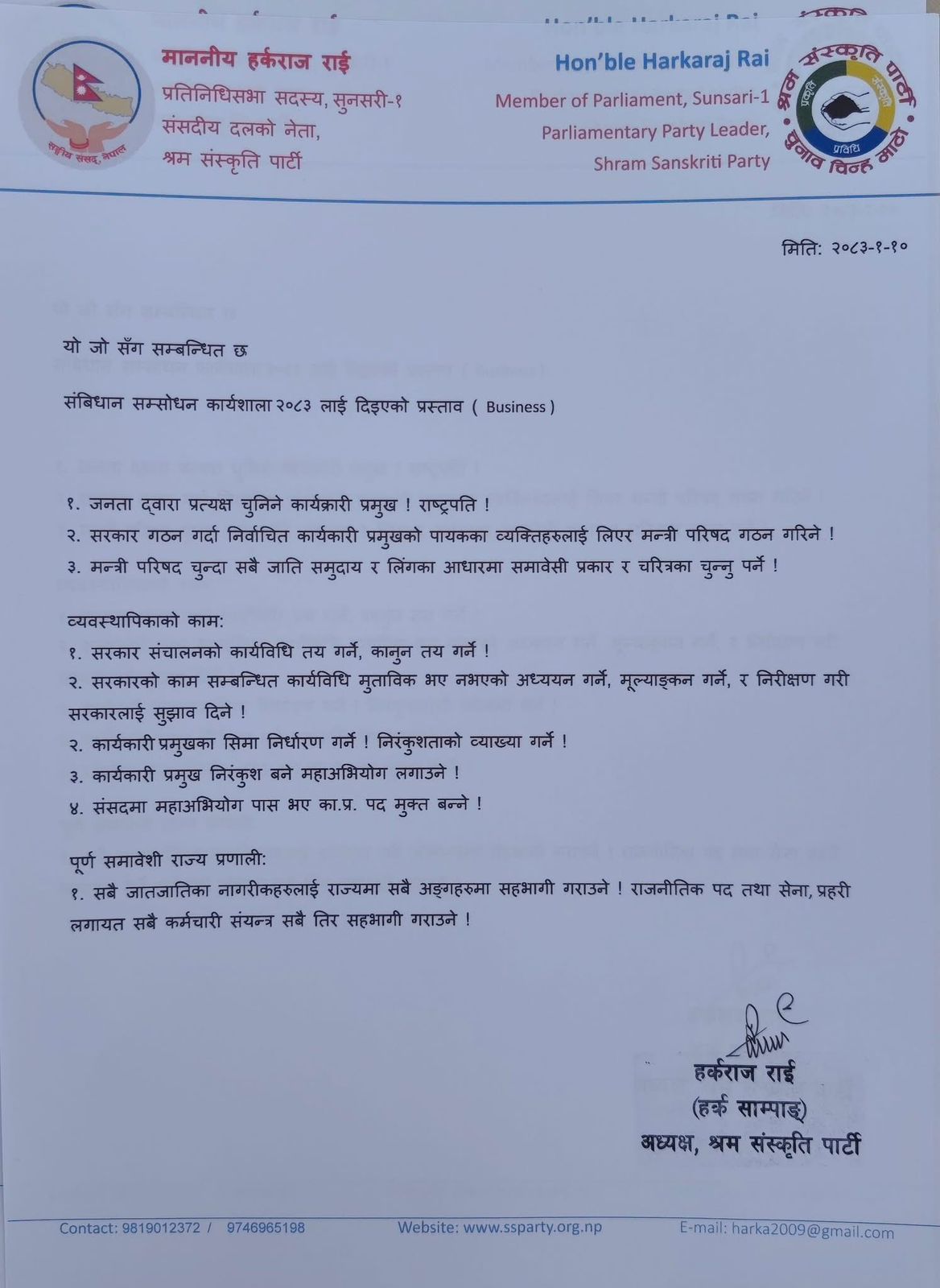 काठमाडौं । श्रम संस्कृति पार्टी प्रत्यक्ष निर्वाचित कार्यकारी राष्ट्रपतीय प्रणालीको पक्षमा उभिएको छ। पार्टीका अध्यक्ष हर्क साम्पाङले संविधान संशोधनको लागि आफ्नो पार्टीको धारणा सार्वजनिक गरेका हुन्।
