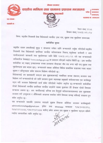 मन्त्रालयले यसअघि इमेलमार्फत तथा व्हाट्सएप मार्फत समेत राय, सुझाव तथा पृष्ठपोषण पठाउन सकिने जनाएको छ ।